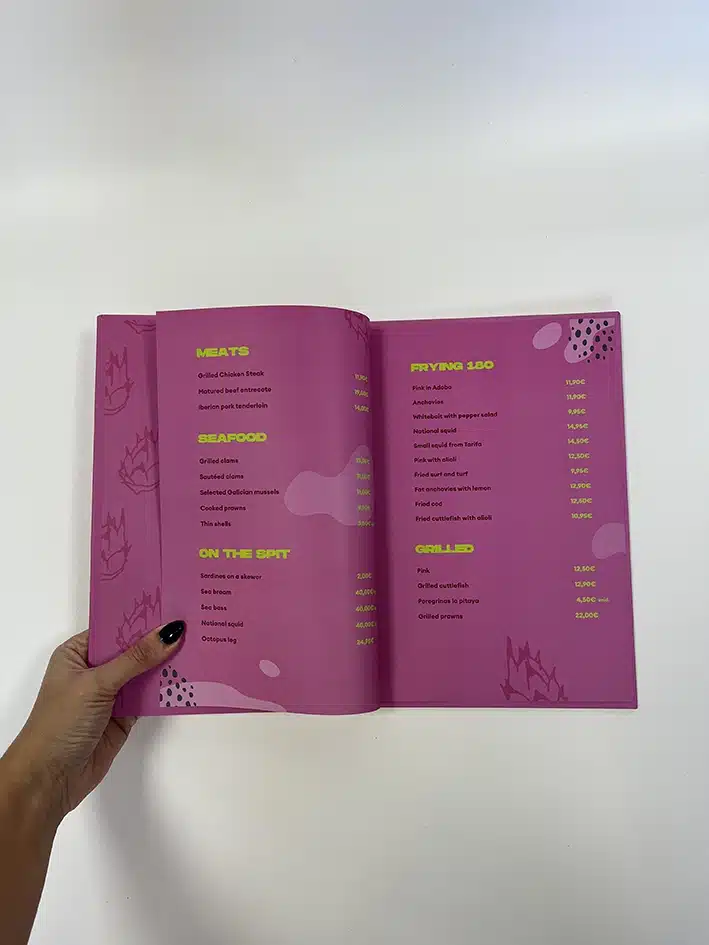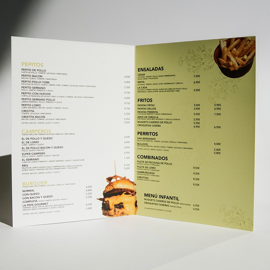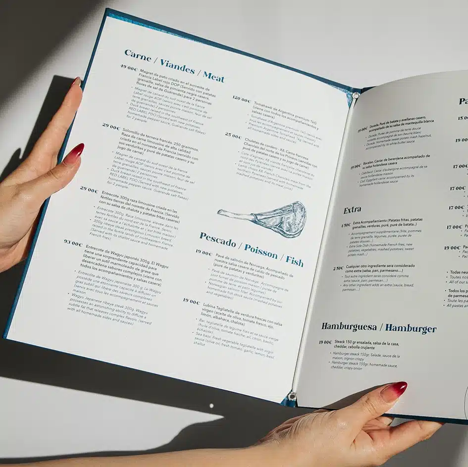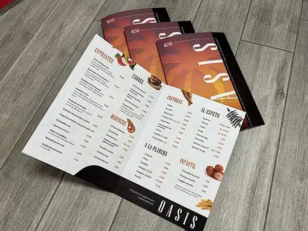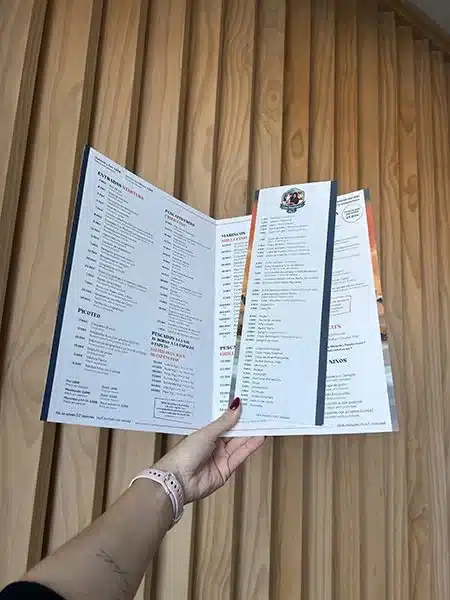 4. Impresión de Alta Calidad: Utilizamos materiales de primera calidad para garantizar que tus cartas sean duraderas y resistentes al uso diario. Los colores serán vibrantes y nítidos, y la calidad del papel destacará la calidad de tu restaurante.